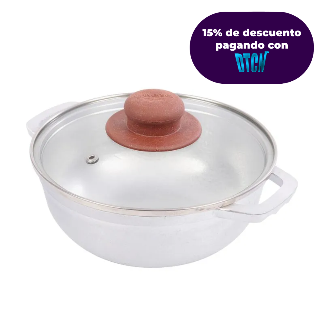 Adquiere en línea nuestra resistente cacerola en aluminio fundido con tapa de vidrio y descubre la mejor de cocinar tus recetas.
