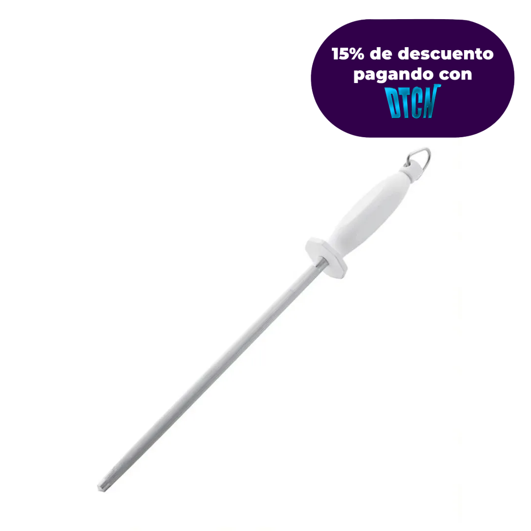 ¡El complemento ideal para tu set de cuchillos profesionales! Cómpralo a solo un clic. • Fabricado en acero al carbono profesional. • Estrías uniformes para mantener el filo del cuchillo. • Mango en polipropileno antibacteriano. • Longitud total: 44.7 cm. • Garantía hasta por 1 año por defectos de fabricación y/o materiales. Materiales • Acero al carbono: 80% • Polipropileno: 20%