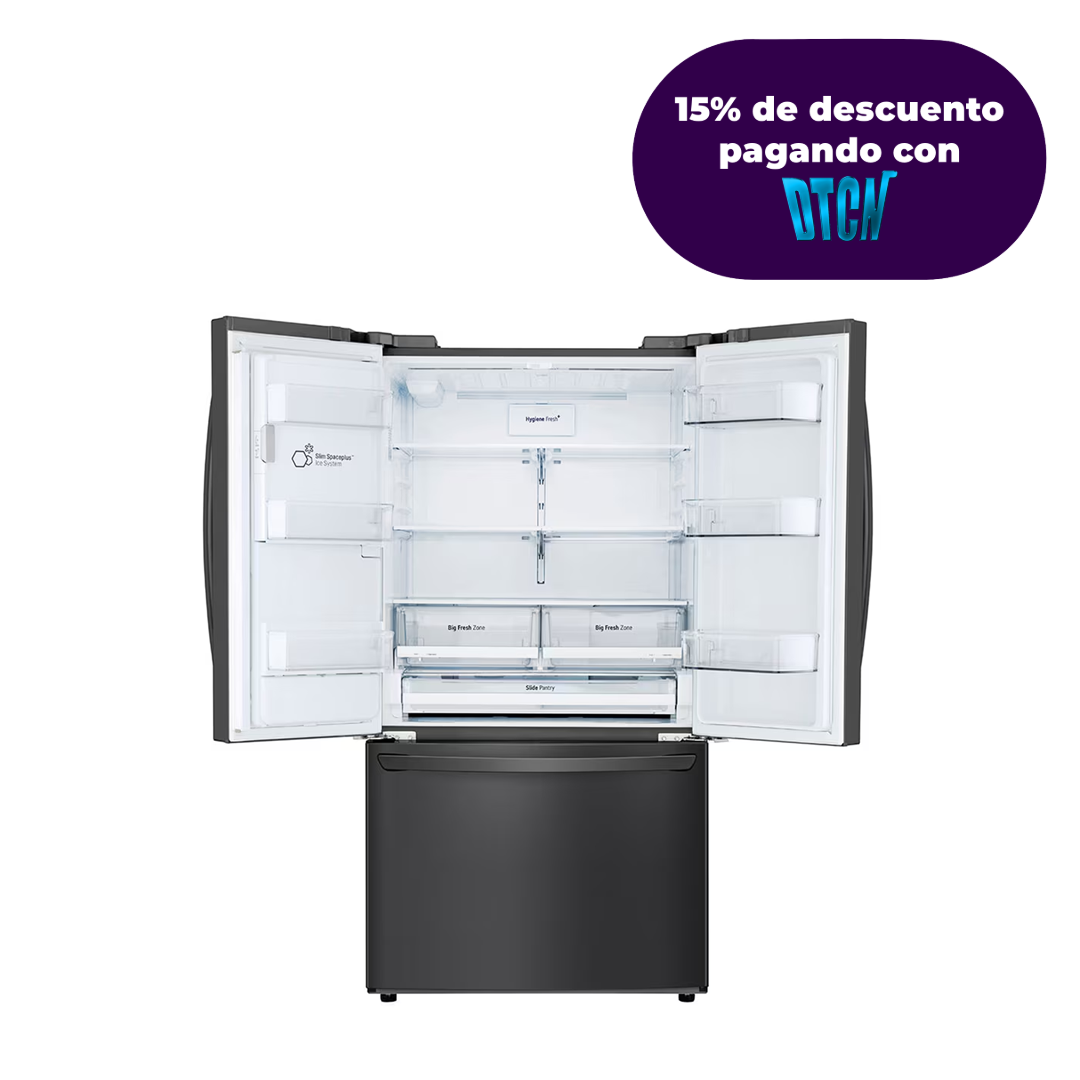 Nevecón LG tipo Europeo de gran capacidad espacios más optimizados para una mejor organización del espacio, , mantén tus alimentos y bebidas siempre frescos y con la misma temperatura inclusive desde la puerta con la tecnología DoorCooling, con la tecnología Multi Air Flow la circulación de aire frío a cada esquina del refrigerador es constante asegurando que cada uno de los alimentos se enfríen adecuadamente, disfruta del sistema automático de agua y hielo desde la puerta, Ahorra energía y disfruta 10 años de tranquilidad con Smart Inverter Compressor ¡Compra Ahora
